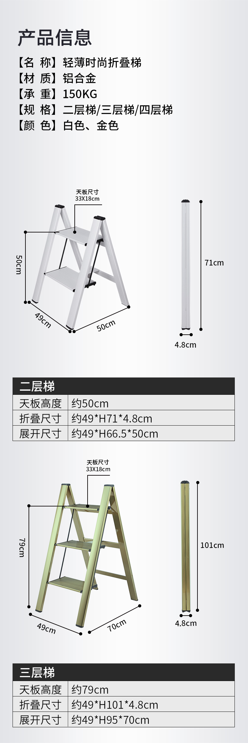 超薄时尚折叠三层梯子 金色