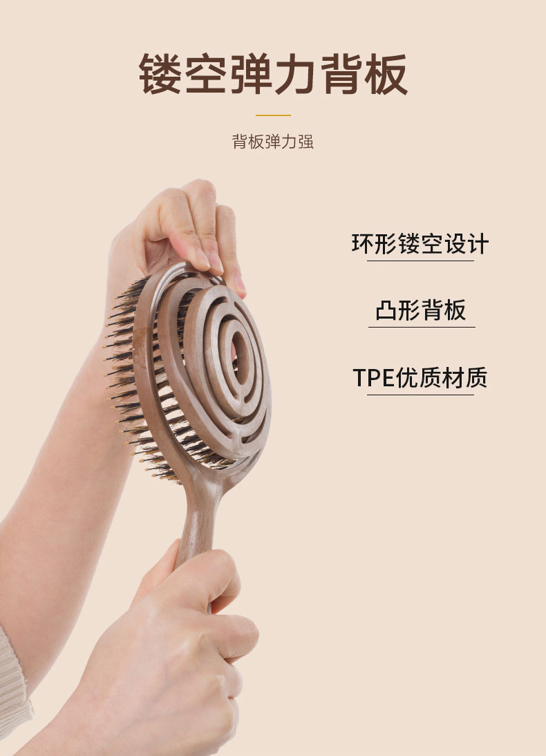 镂空按摩梳 圆形猪鬃毛款 木纹棕