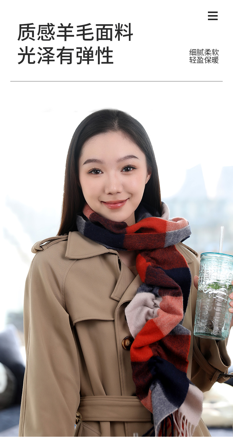 褶皱格纹羊毛围巾 酒红色