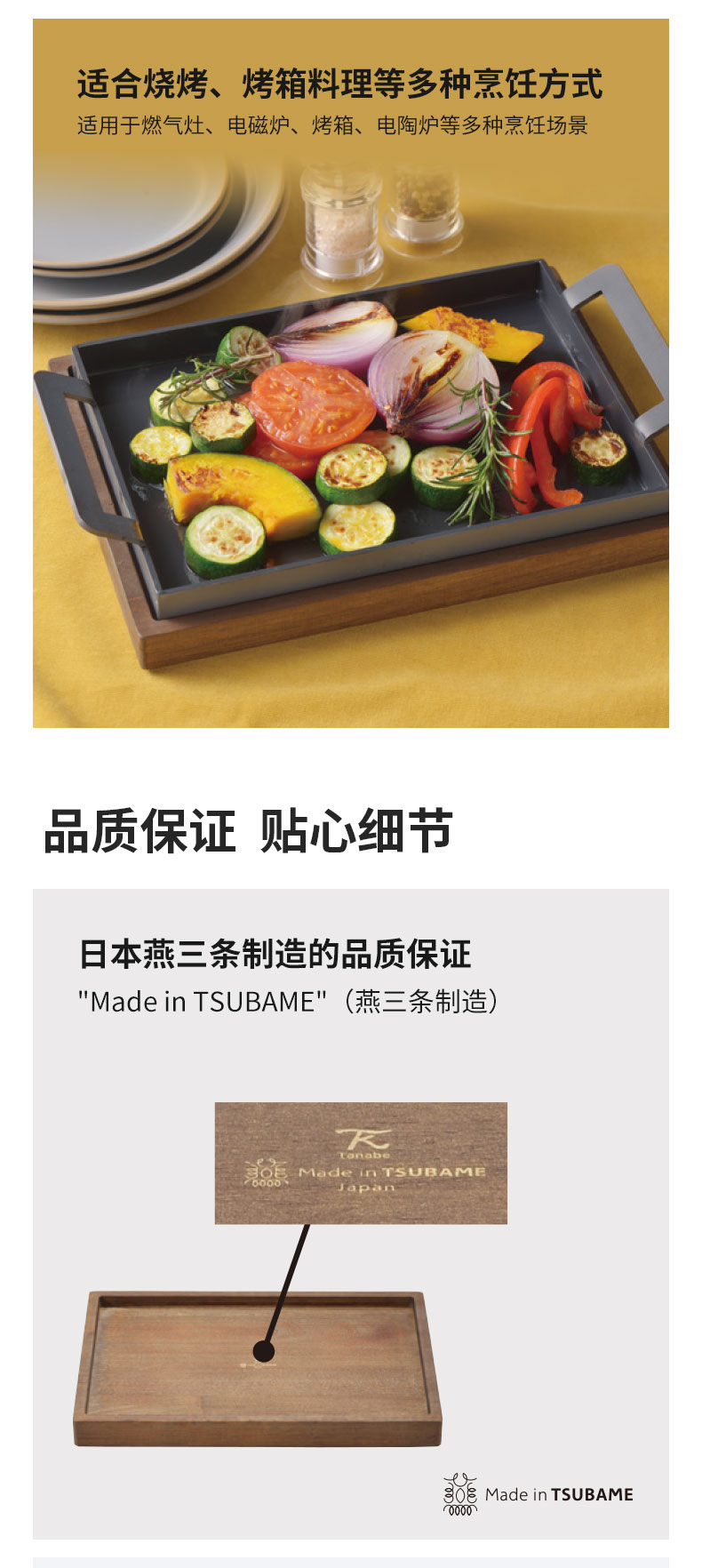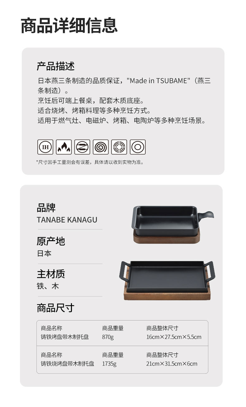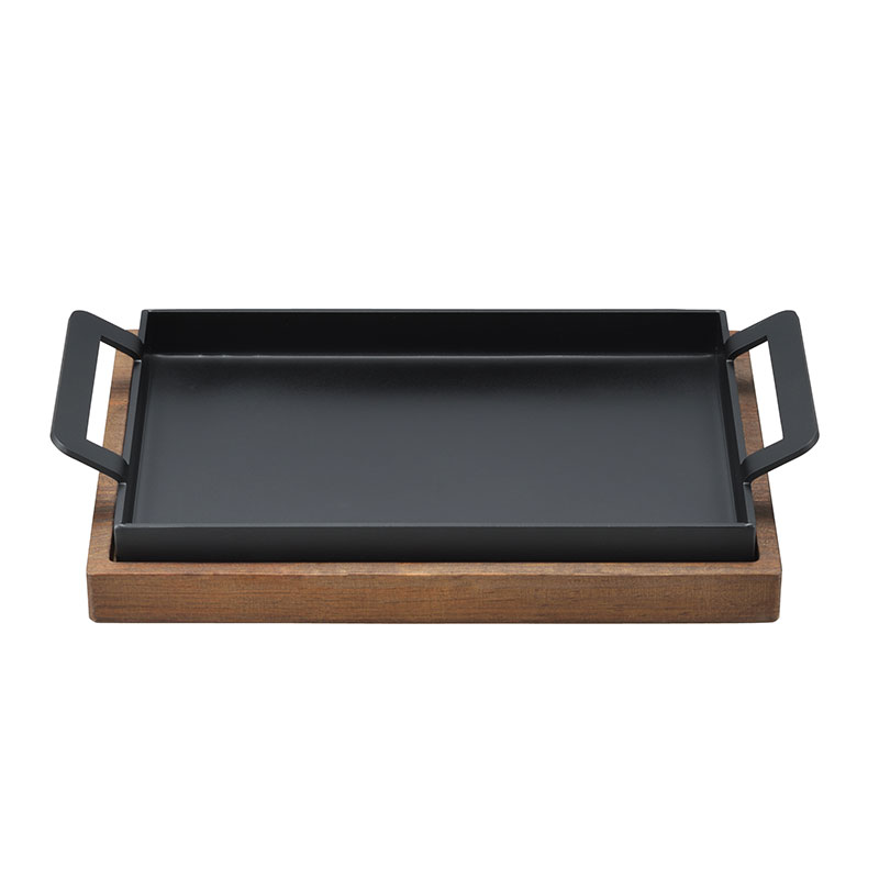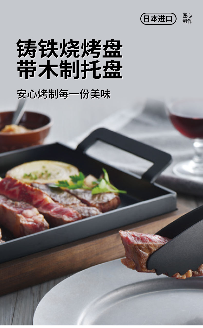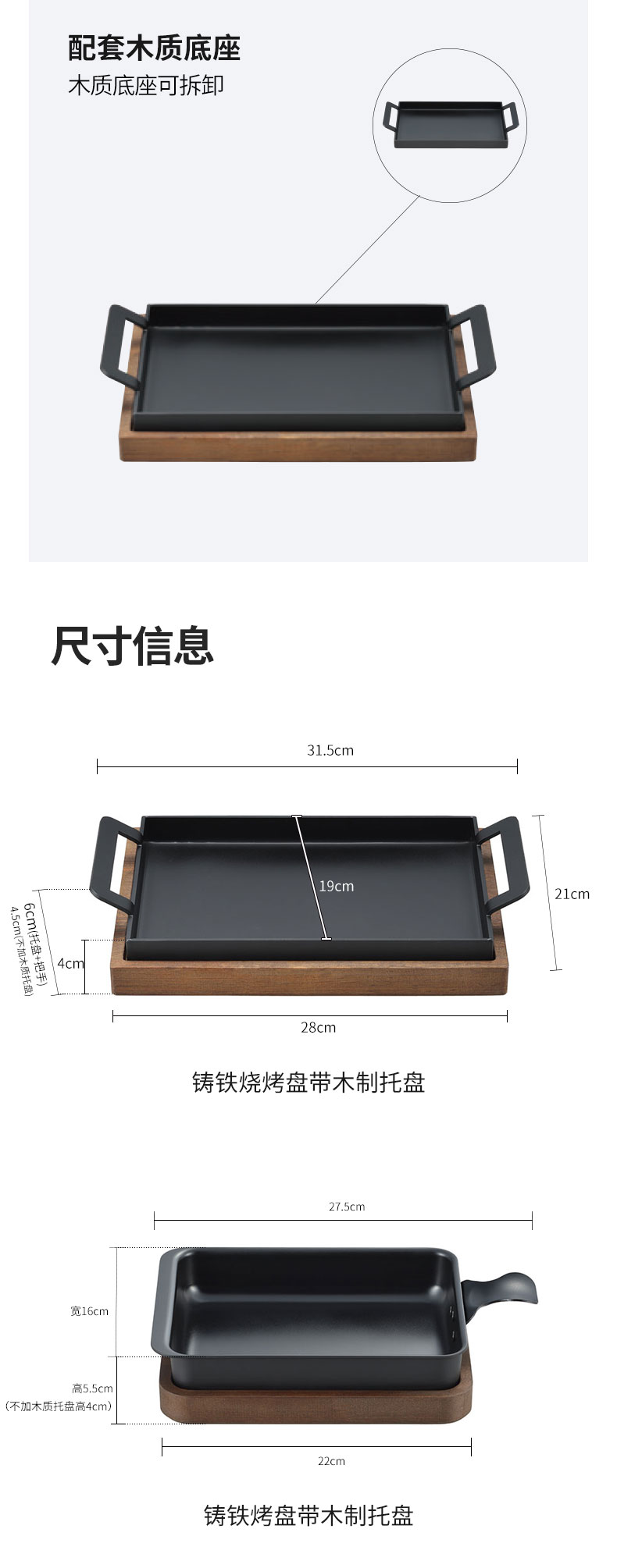 铸铁烧烤盘带木制托盘19cm×31.5cm×4.5cm